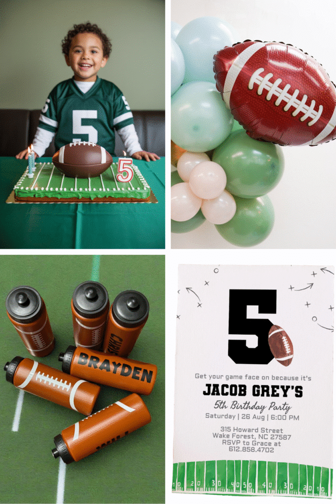 Think tailgate snacks, yard line tablecloths, and penalty flag goodie bags.