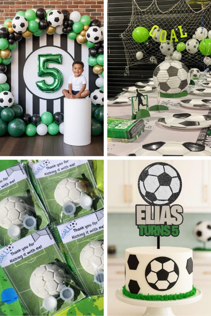 Add green turf rugs, black-and-white soccer balloons, and referee-striped napkins.