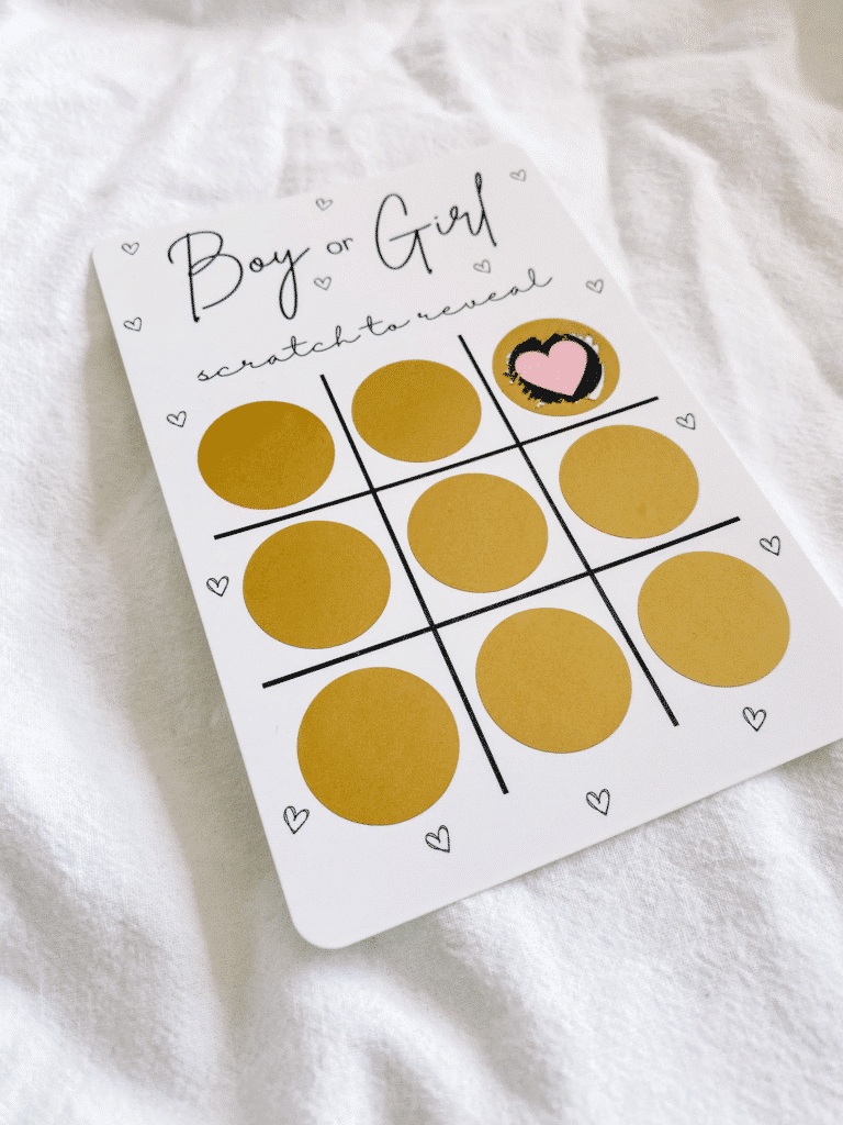 Prediction scoreboard. Tally “team boy/girl” before the reveal; snap the final.