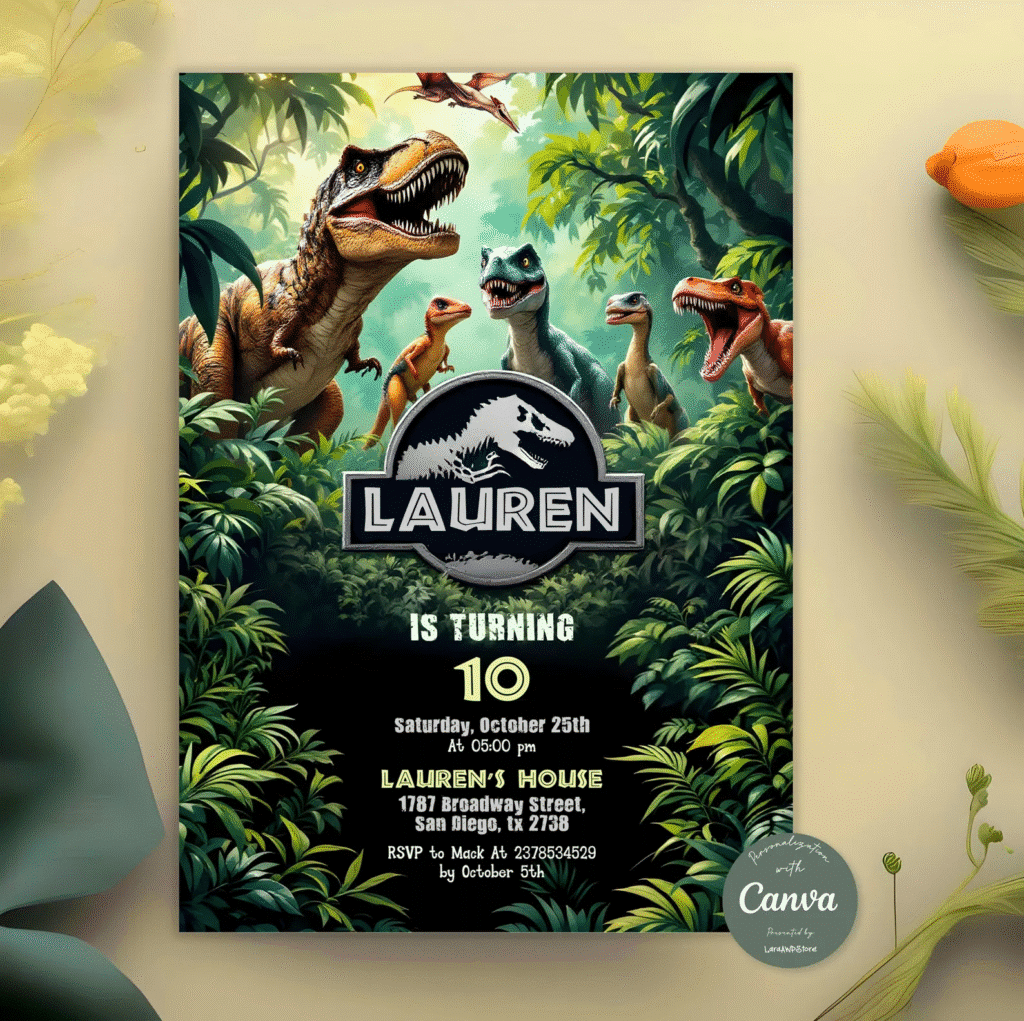 You can grab digital or printable invites on Etsy, or design your own with Canva. Add a little dino footprint or a volcano illustration to seal the deal.