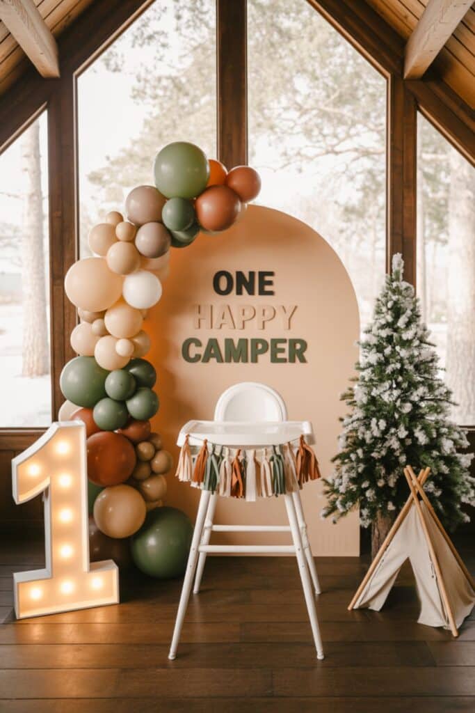Decor idea: Mix earthy balloons (sage, tan, rust) with a wooden arch backdrop and a small frosted tree for that winter-camp vibe.