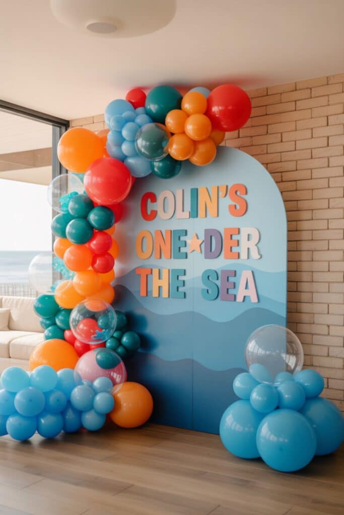 Decor idea: Lean into layered blues with pops of orange and red for a vibrant ocean feel. Clear “bubble” balloons add such a fun underwater touch.