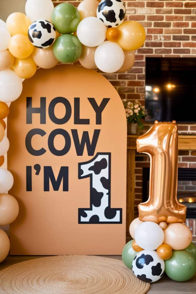 Decor idea: Use a tan arch backdrop with western lettering, stars, and a balloon garland in cream, gray, and cow print for an instant “rodeo” moment.