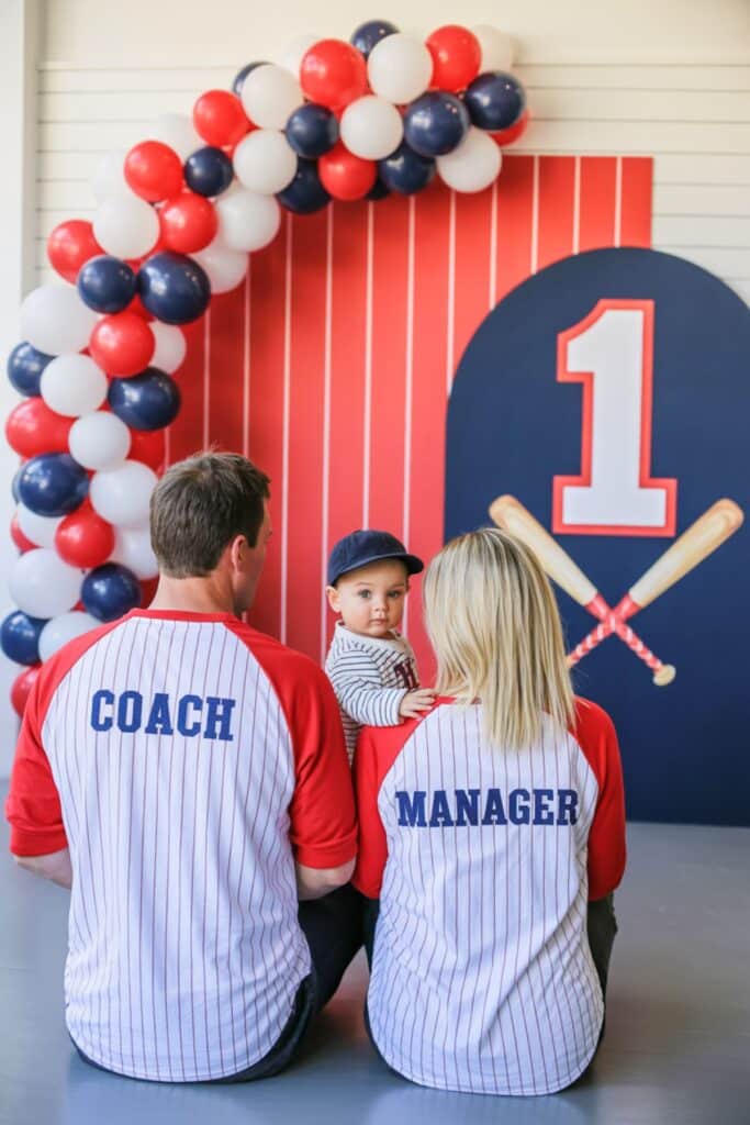 Photo moment: Grab a family shot from behind—your matching jerseys and the balloon arch turn it into the cutest keepsake.