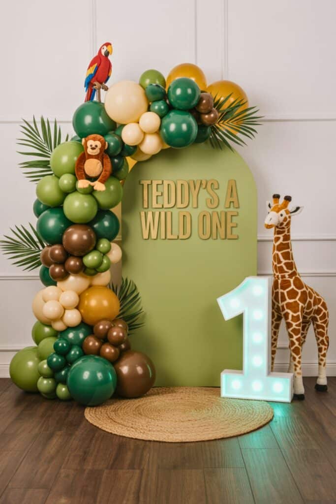 Decor idea: Layer greens, browns, and soft yellows in your balloon garland to mimic jungle foliage. Palm leaves instantly add texture, and a tall giraffe or plush animals bring the whole theme to life.