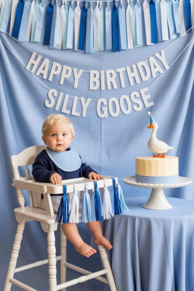 Smash cake idea: A small buttercream cake with a gingham ribbon and a goose topper brings the theme together without needing elaborate detailing.