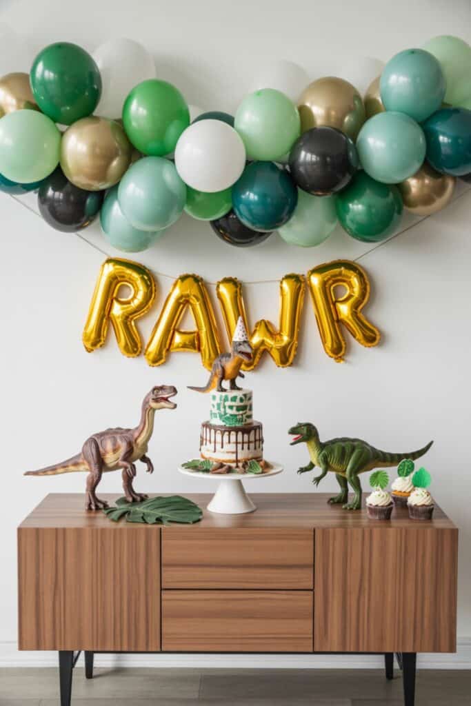 Add faux leaves, toy dinosaurs, and a simple “RAWR” balloon banner to tie it all together without going overboard.
