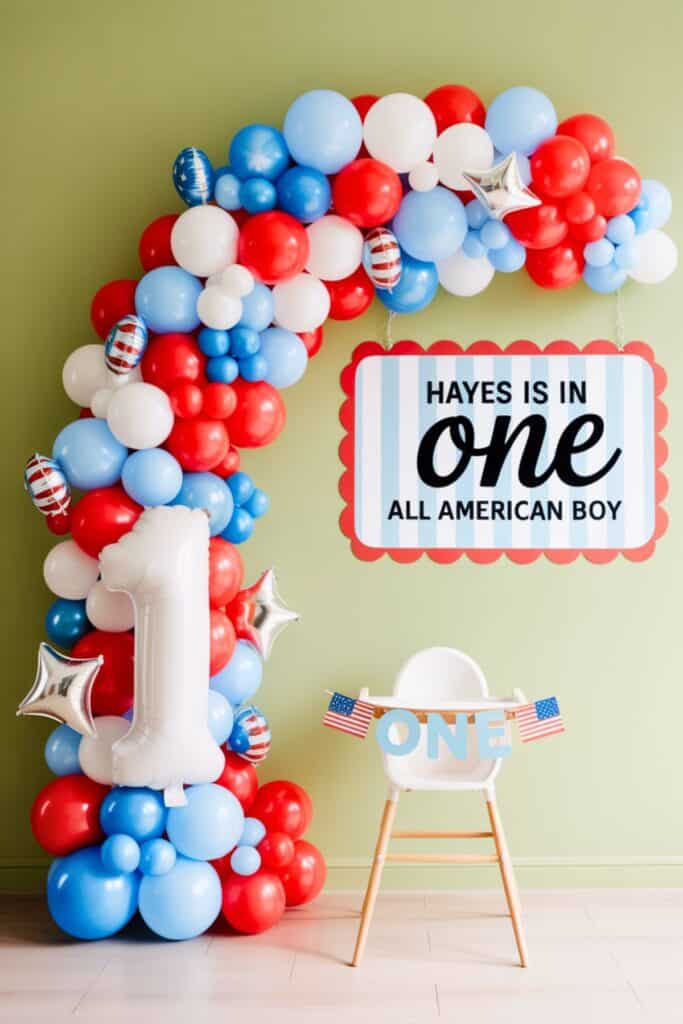 Add a red/white/navy balloon arch to frame the whole moment and make it look polished.