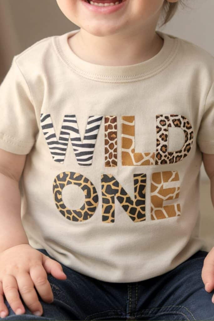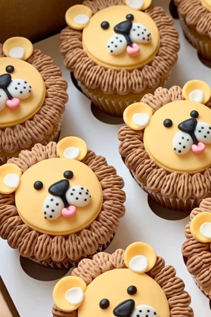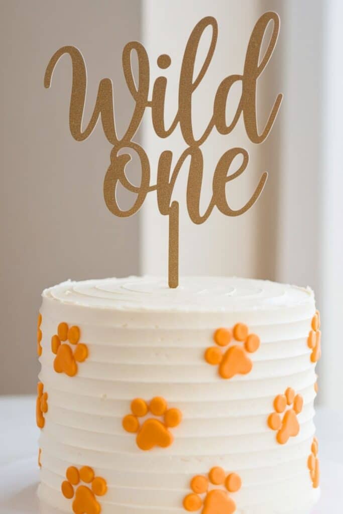Serve animal-themed cupcakes (zebra stripes, lion faces) and a smash cake decorated with greenery and a gold “Wild One” topper.