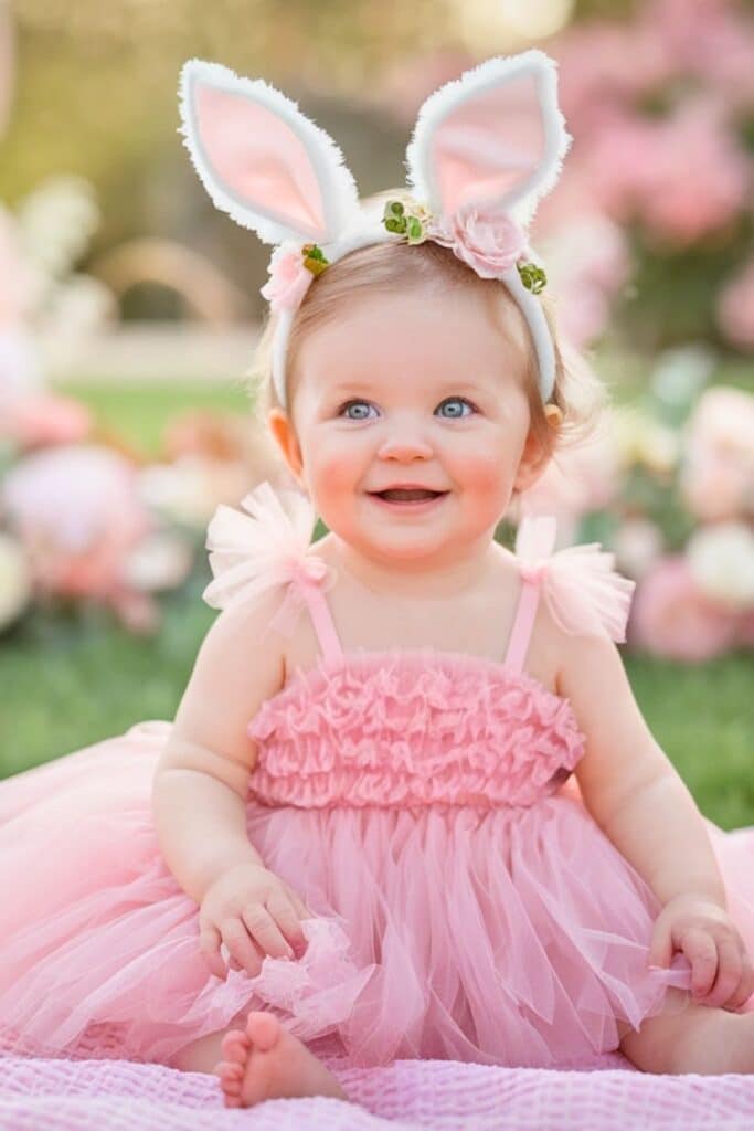 Think bunny ear headbands for guests, carrot centerpieces, and floral garlands hanging from the highchair.