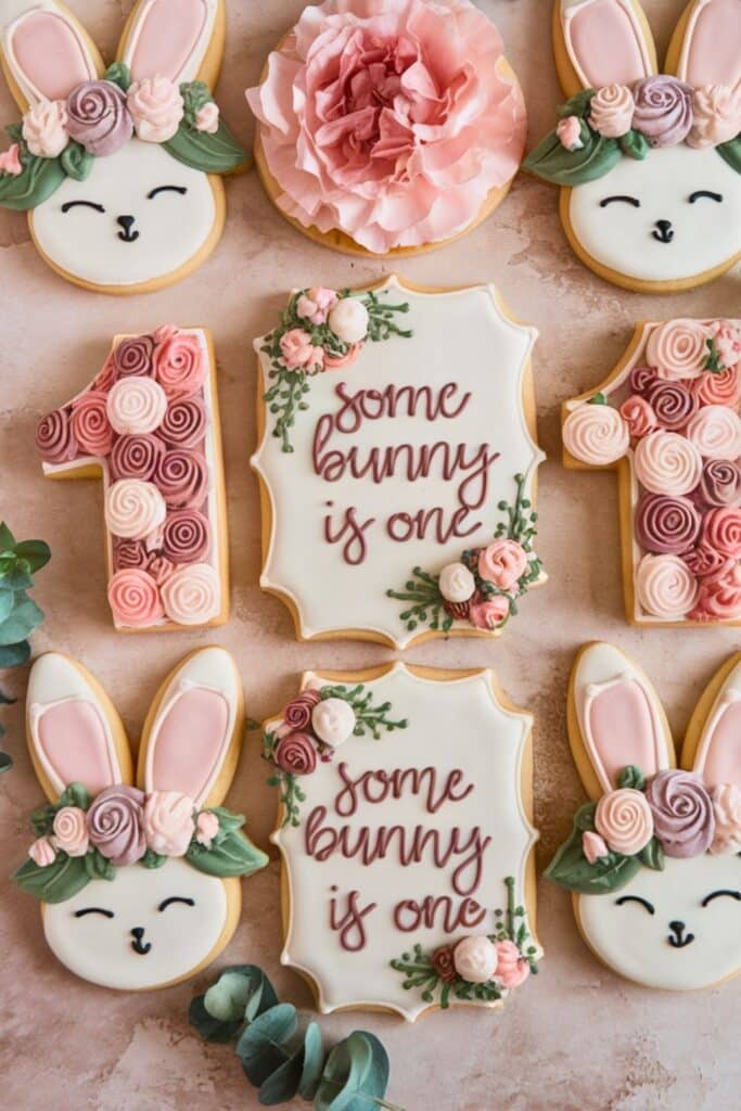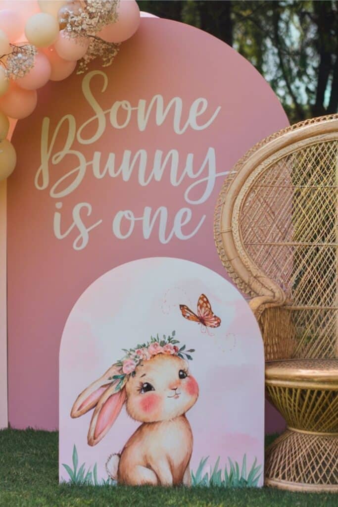 Adorable Some Bunny is One first birthday party ideas for a baby girl’s first birthday. This bunny-themed celebration includes a pink balloon garland, bunny-shaped cookies, a bunny highchair banner, a floral cake with bunny decorations, and a sweet outdoor photo of the birthday girl in bunny ears and a pink dress. Perfect for a spring first birthday party, Easter baby celebration, or garden-themed birthday.