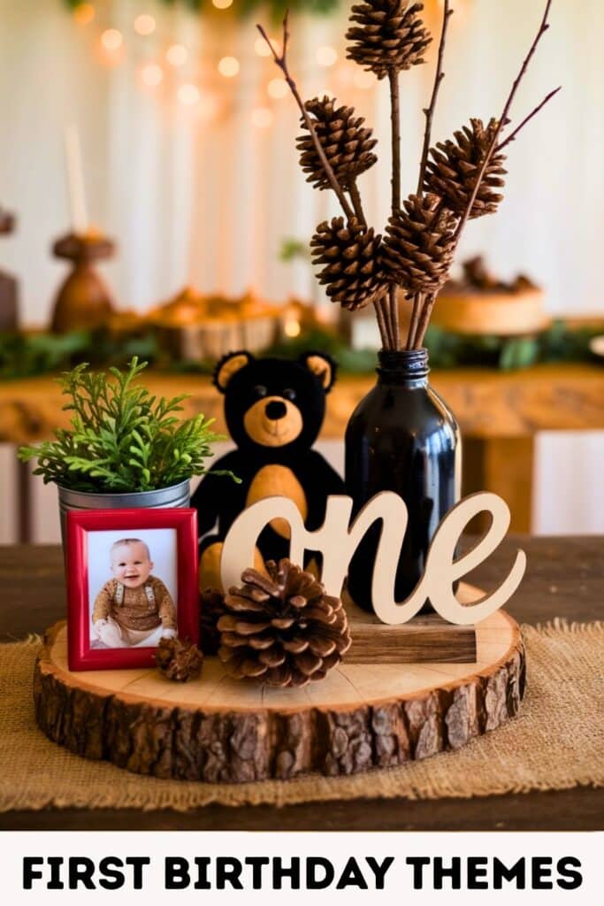 The smash cake can look like a wood log with bear tracks across the top — super cute for winter babies.
