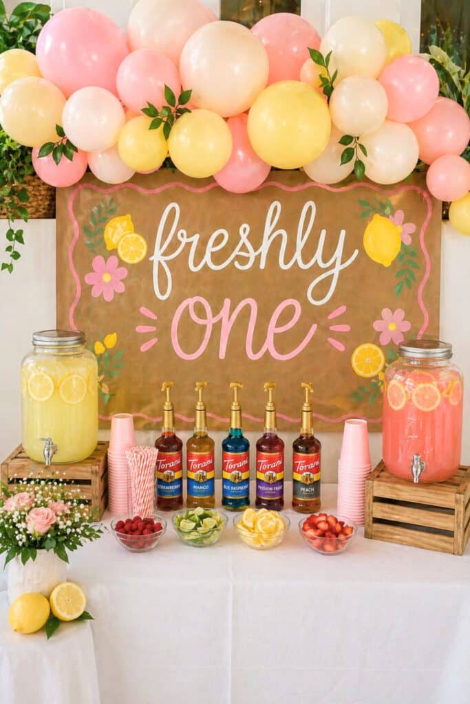 Freshly one first birthday party backdrop with pink and yellow balloon arch and “She’s Freshly One” sign for a baby girl party