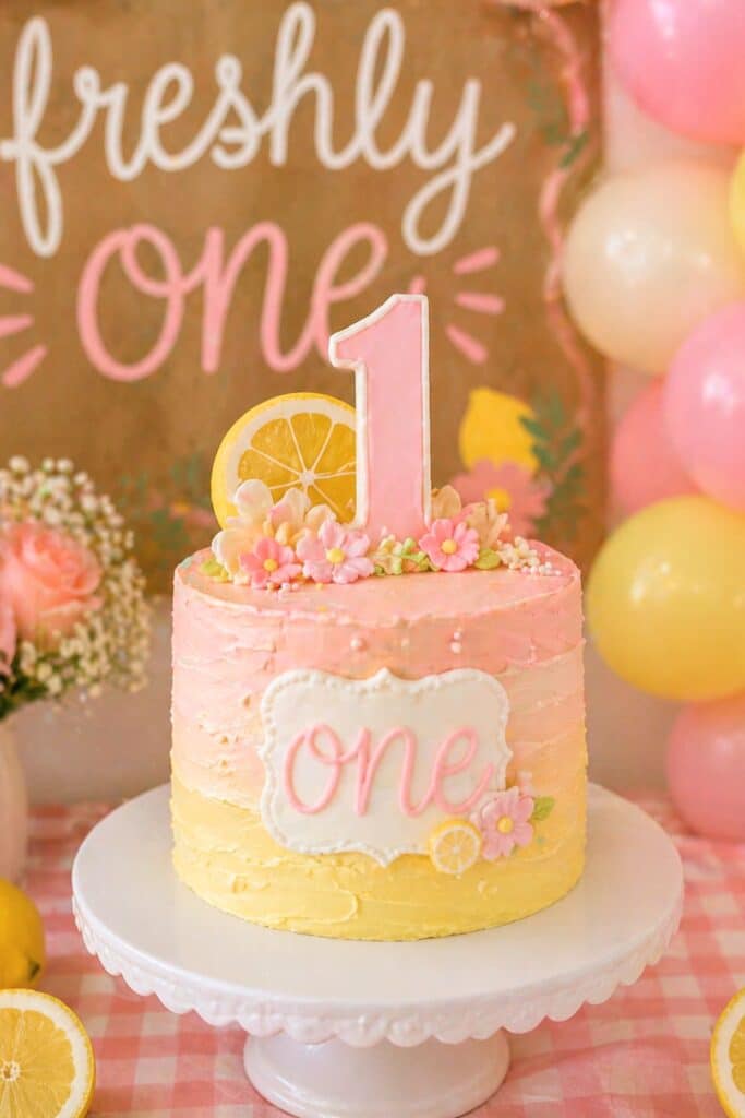 Freshly one first birthday cake with pink and yellow ombre frosting and number one topper for a lemon themed baby girl party