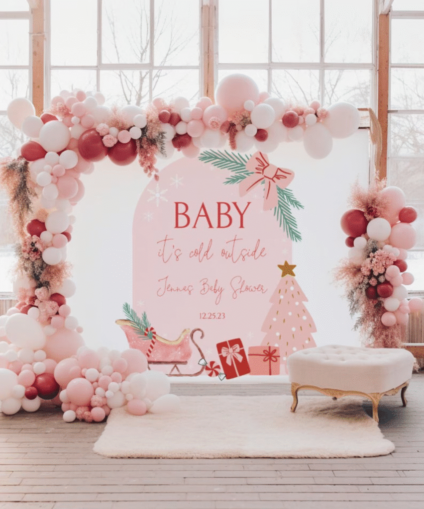 Soft tulle + blush/rose-gold balloon garland; add a frosted-acrylic sign that reads “Baby, It’s Cold Outside.”
