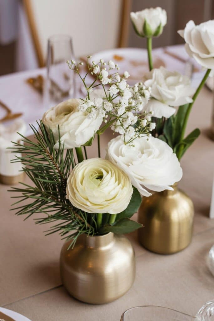 White florals (ranunculus, roses, baby’s breath) with evergreen sprigs in gold bud vases.